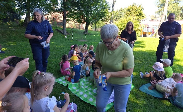 Wszyscy chętnie brali udział w spotkaniu, zadawali pytania i uczestniczyli w dyskusjach o bezpiecznym zachowaniu. Na zakończenie spotkania każde dziecko otrzymało od funkcjonariuszy opaski tzw. „niezgubki”, które umieszczone na ręku dziecka podpowiedzą jak skontaktować się z rodzicem. Na takiej opasce znajduję się numer alarmowy oraz miejsce na umieszczenie imienia i nazwiska dziecka, oraz numer telefonu do opiekuna.