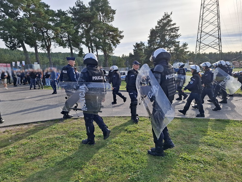 W minioną sobotę policjanci z lęborskiej komendy, wspierani przez funkcjonariuszy Oddziału Prewencji w Gdańsku oraz policjantów z innych pomorskich jednostek, zabezpieczali w Lęborku mecz piłkarski rozgrywany pomiędzy Pogonią Lębork i Pomezanią Malbork. Jako, że w przeszłości dochodziło już do prób siłowej konfrontacji pomiędzy pseudokibicami obu tych drużyn, sobotnie spotkanie zostało zakwalifikowane jako mecz o podwyższonym ryzyku. Mundurowi zabezpieczali teren wokół stadionu, kontrolowali trasy przemieszczania się pseudokibiców i patrolowali miasto pod kątem możliwych zakłóceń porządku publicznego. Dzięki zaangażowaniu w zabezpieczenie odpowiednich sił i środków policyjnych, jak również dobremu rozpoznaniu oraz skutecznej wymianie informacji pomiędzy patrolami operacyjnymi i monitorującymi trasy przemieszczania się pseudokibiców, zarówno w obrębie stadionu, w mieście jak i na drogach dojazdowych, nie doszło do poważniejszych incydentów. W trakcie meczu na trybunach kibiców lęborskiej drużyny zostały odpalone race świetlne i petardy hukowe. Policjanci zarejestrowali te wykroczenia i już analizują nagrania pod kątem ustalenia osób za nie odpowiedzialnych.