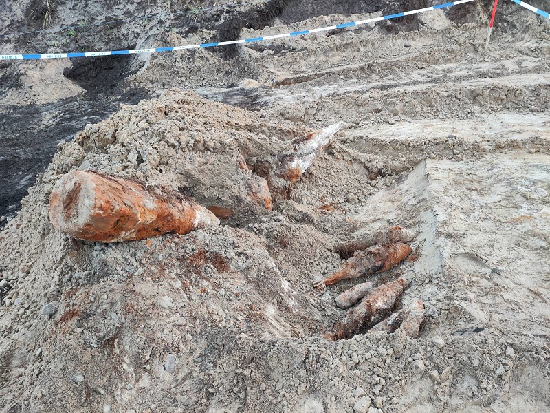 W środę 1 października dyżurny lęborskiej Policji otrzymał zgłoszenie o częściowo odkopanych na terenie budowy linii kolejowej w Lęborku dużych rozmiarów niewybuchach. O niebezpiecznych znaleziskach poinformował policjantów pracownik firmy wykonującej prace budowlane. Natknął się na nie operator koparki, pracującej na dużych głębokościach. Koparka odsłoniła trzy skorodowane pociski kal. 280 mm do armaty kolejowej i pięć granatów moździerzowych. Na miejsce niezwłocznie zostali skierowani policjanci, w tym funkcjonariusz z grupy rozpoznania minersko – pirotechnicznego. Mundurowi odgrodzili i zabezpieczyli zagrożony teren do czasu przyjazdu na miejsce wojskowych saperów. W piątek saperzy przy użyciu specjalistycznego sprzętu, niezbędnego do wydobycia wciąż jeszcze tkwiących pod ziemią dużych rozmiarów niewybuchów, podjęli niebezpieczne znaleziska. Policjanci ruchu drogowego zablokowali na czas prowadzonych czynności drogi dojazdowe do zagrożonego miejsca i zadbali by nie miały do niego dostępu osoby postronne. Dokładne sprawdzenie terenu skutkowało jeszcze kolejnymi „niespodziankami” w postaci 11 pocisków artyleryjskich kal. od 76 do 105 mm, trzech pocisków do granatnika i dwóch kolejnych granatów moździerzowych. Łącznie odkopano i zabezpieczono 24 niewybuchy. Wszystkie zostały przetransportowane na poligon wojskowy.
