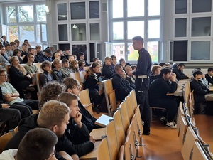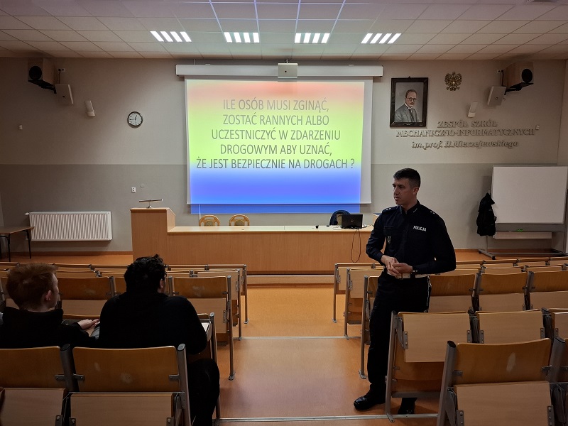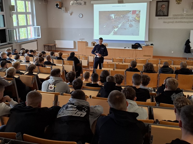 Naczelnik Wydziału Ruchu Drogowego Komendy Powiatowej Policji w Lęborku przeprowadził w Zespole Szkół Mechaniczno – Informatycznych prelekcję dotyczącą bezpieczeństwa w ruchu drogowym. Policjant, wykorzystując multimedialną prezentację, w obrazowy sposób przedstawił młodzieży skutki brawury za kierownicą samochodu i motocykla.