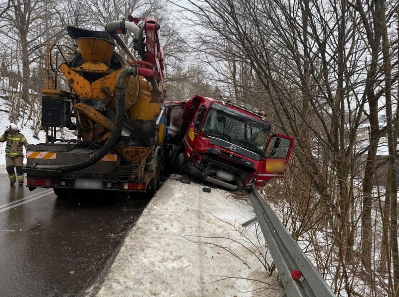 Po godzinie 10:00 w Kębłowie Nowowiejskim kierujący ciężarowym Volvo 37-latek na łuku nie dostosował prędkości do panujących na drodze warunków, zjechał na przeciwległy pas i uderzył w jadącą z naprzeciwka betoniarkę. Volvo zsunęło się ze skarpy. Trzeba było użyć dźwigu, by wyciągnąć pojazd na drogę. W tym czasie w tym samym miejscu kierujący Oplem 39-latek, podczas omijania unieruchomionych w/w pojazdów, na łuku drogi zjechał na przeciwległy pas uderzając w Volvo i betoniarkę.