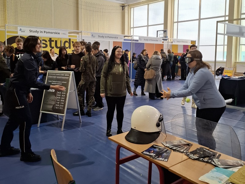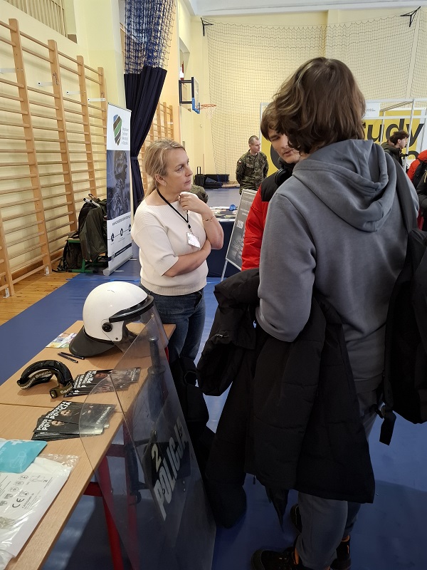 Przy swoim stoisku funkcjonariusze zachęcali młodzież, która wiąże swoją przyszłość z mundurem, do wstąpienia w szeregi Policji. Nie zabrakło pokazu sprzętu, jaki na co dzień funkcjonariusze wykorzystują w służbie oraz rozmów dot. zasad rekrutacji. Tegoroczni maturzyści dowiedzieli się jak różnorodne zadania można wykonywać będąc policjantem, w zależności od własnych predyspozycji, zainteresowań i zdobytych kwalifikacji. Jednym z plusów jest niewątpliwie fakt, że w pracy policjanta nie ma miejsca na rutynę, każdy dzień przynosi nowe wyzwania. Ponadto pracując w jednej organizacji, jaką jest Policja, nie trzeba ograniczać się do służby w jednej komórce/wydziale. Choć zazwyczaj pierwsze szlify zdobywa się w pionie prewencyjnym, z czasem każdy funkcjonariusz ma możliwość dalszego rozwoju zawodowego i realizowania swoich pasji.