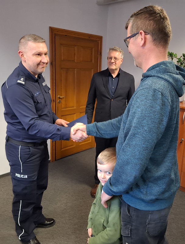 W piątek 6 marca Komendant Powiatowy Policji w Lęborku mł. insp. Arkadiusz Guzek oraz jego zastępca mł. insp. Grzegorz Jarosiewicz podziękowali Panu Pawłowi za jego niezwykłą odwagę i zaangażowanie w niesieniu bezinteresownej pomocy drugiemu człowiekowi.